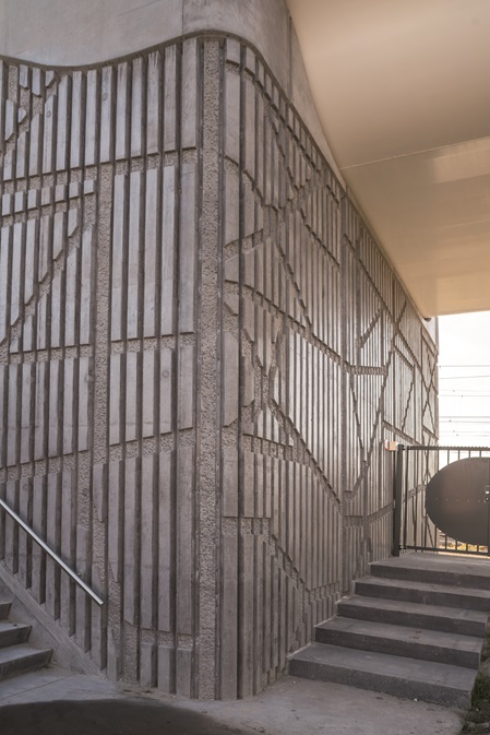 Für eine klare visuelle Erkennbarkeit liegt das Muster bis zu 60 mm tief im Beton. Um diese Tiefe zu erreichen, ist eine Profilierung mit den bekannten NOEplast Strukturmatrizen eine kostspielige Lösung. Daher wurde ein kombinierter Ansatz vorgeschlagen: Auf der Schalung wurde von der Baufirma eine Spundwand-ähnliche Profilierung aus konisch geschabten und lackierten Holzbalken angebracht. Dazwischen wurde das robust profilierte, 30 mm tiefe Straßenmuster angebracht. Diese wurden von NOE-Betonvormgeving aus CNC-gefrästen NOE Modellbauplatten mit Bayreuth-Matrizen hergestellt. Die Oberfläche der Modellbauplatte wurde mit der NOEplast Strukturmatrize Typ Bayreuth ausgestattet.